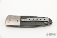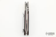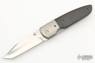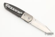 This Recondo Linerlock Folder by Tim Britton has a satin finished clip point tanto blade with notched thumbrest and single thumbstud. Handle has satin titanium bolsters, lightning strike carbon fiber scales over red liners, bead blasted stainless steel liners, bead blasted stainless steel clip, tip up carry. Excellent lockup, blade seating and detent. Comes with leather zippered case. Excellent condition.