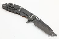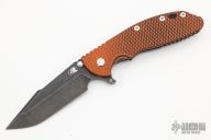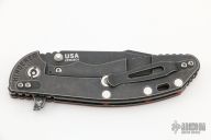 This XM-24 by Rick Hinderer features a tumble finished clip point blade with swedge, dual thumb studs, notched thumbrest and flipper. The handle is comprised of a textured G10 scale over titanium liner on the "A" side and a tumbled titanium and battle black finish lock side over titanium barrel spacers. The tumbled titanium pocket clip is reversible for tip up/down, right hand carry. Includes original box and extra hardware. Excellent condition.