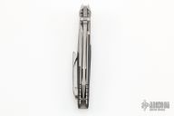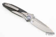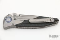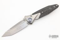 This Socom Bravo by Microtech is made in China by Rike Knife, it features a bead blasted blade, notched thumbrest, and dual thumbstuds. The handle has bead blasted titanium bolsters/liners, blue anodized pivot collars, carbon fiber scales. Tip up carry bead blasted titanium clip. Bead blasted titanium backspacer. Dated 02/2022 and s/n 0767. Comes with original box and papers. Excellent condition.