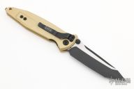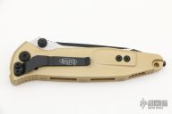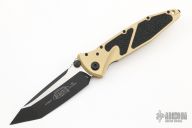 This Socom Elite manual linerlock folder by Microtech Knives has a black tanto blade with notched thumbrest and dual thumbstuds. Has a champagne gold aluminum handle with non-slip inlays, tip down blasted stainless steel clip. Serial number 6907 and dated 01/2020. Comes with original box and papers. Excellent condition.