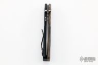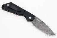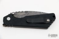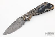 This Strider SNG by Pro-Tech and Strider Knives features a Damascus blade with notched thumbrest. The handle has a Camo and black aluminum frame with black finish stainless steel tip up. Mother of Pearl inlaid release button. Has a safety. Comes with original box and papers. Excellent condition.