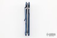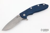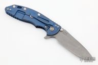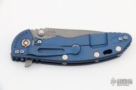 This XM-18 Flipper by Rick Hinderer Knives features a 3.5" working finished blade, notched thumbrest and flipper, dual thumbstuds. The handle has a black/blue G-10 scale, and Battle Blue titanium handle/clip. Clip can be mounted for tip up or down carry. Nice lockup, seating, and detent. Comes with original box and extra hardware. New condition.