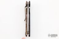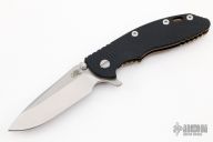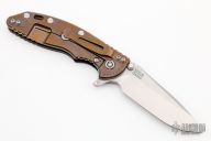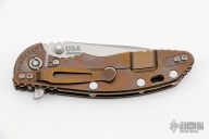 This XM-18 Flipper by Rick Hinderer Knives features a 3.5" stonewash finished blade, notched thumbrest and flipper, dual thumbstuds. The handle has a black G-10 scale, and stonewashed bronze titanium handle/clip. Clip can be mounted for tip up or down carry. Nice lockup, seating, and detent. Comes with original box and extra hardware. New condition.