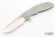 This XM-18 Flipper by Rick Hinderer Knives features a 3.5" stonewash finished blade, notched thumbrest and flipper, dual thumbstuds. The handle has a translucent green G-10 scale, and stonewashed titanium handle/clip. Clip can be mounted for tip up or down carry. Nice lockup, seating, and detent. Comes with original box and extra hardware. New condition.