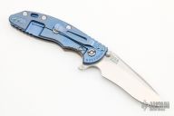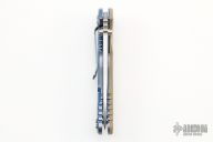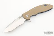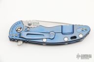 This XM-18 Flipper by Rick Hinderer Knives features a 3.5" stonewash finished blade, notched thumbrest and flipper, dual thumbstuds. The handle has a coyote brown G-10 scale, and stonewashed blue titanium handle/clip. Clip can be mounted for tip up or down carry. Nice lockup, seating, and detent. Comes with original box and extra hardware. New condition.