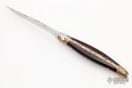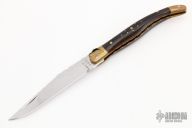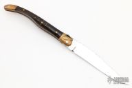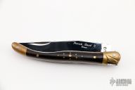 This Slipjoint by Laguiole features a mirror polished clip point blade with a nail nick and a fileworked spine.  The handle features brass carved bolster, fileworked brass liners, fileworked stainless steel backspring, ebony wood covers with snakewood liners. Has a little patina, otherwise excellent condition.