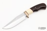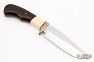This hunter by Tom McLuin features a hand rub satin finished blade that has filework on spine and false top edge, .180" blade stock and 1.444" blade depth, hidden tang construction. The handle has a mokume guard, cocobolo and stag grip. Excellent condition.