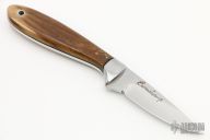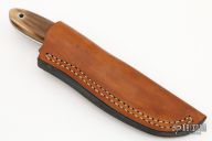 This piece by Gaetan Beauchamp features a hand rub satin finished blade with full tang construction, .134" blade thickness and .840" blade depth. The handle has dovetailed mirror polished stainless steel bolsters, stabilized bone scales with black linen micarta liners. Nicely contoured handle. Comes with a brown leather sheath. Excellent condition.