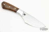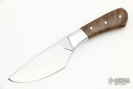 This knife (please let us know if you know who this maker is, the mark is an anvil with an F inside) features a satin finished blade with .138" blade stock and 1.391" blade depth, full tapered tang construction. The handle has dovetailed aluminum bolsters and wood scales with black liners. Has some light scratches, otherwise good condition.