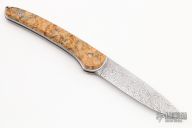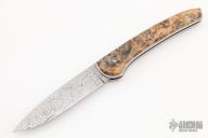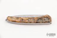 This slipjoint by Le Chignore features a Damasteel blade. The handle has burl wood covers, stainless steel liners and fileworked stainless steel spring. Excellent condition.
