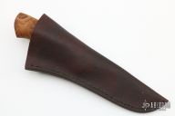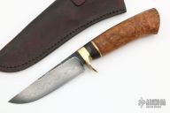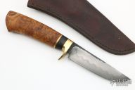 This Hunter by Last Knives features a hand forged hand rub satin finished blade with a nice hamon, .213" blade stock and 1.044" blade depth, hidden tang construction. The handle has a brass guard and a teak burl wood grip, brass and dark wood spacer. Comes with a black leather sheath and COA. New from maker.