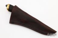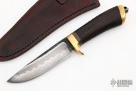 This Takedown Hunter by Last Knives features a hand forged hand rub satin finished SK3 Tool Steel blade with a nice hamon, .240" blade stock and 1.071" blade depth, hidden tang construction. The handle has a brass guard and butt, ebony grip with a sheep horn spacer. Comes with a brown leather sheath and COA. New from maker.