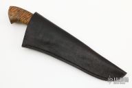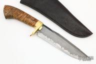 This URSA Special Medium Harpoon Bowie by Last Knives features a hand forged SK3 Tool Steel blade with nice hamon and sharpened top edge, .279" blade stock and 1.671" blade depth, hidden tang construction. The handle has a brass guard and Stabilized Curly Mango wood grip. Comes with a leather sheath and COA. New from maker.