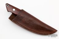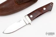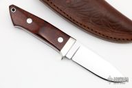 This Drop Point Hunter from T.W. Downing features a mirror polished drop point blade, .191" blade stock and 1.163" blade depth, full tapered tang construction. The handle is comprised of a nickel silver guard with desert ironwood scales, stainless steel pins and lanyard tube in pommel. Includes leather sheath with belt loop. Has some light scratches, otherwise excellent condition.