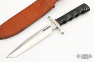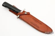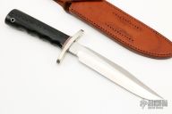 This Model 1-7 from Randall Made Knives features a satin finished clip point blade with false top edge, .203" blade stock and 1.161" blade depth, hidden tang construction. The handle is comprised of a forward curved nickel silver guard, red/white/blue spacers, black linen micarta handle with finger grooves and a lanyard hole. Comes with original brown leather sheath, but the stone pouch has been removed. Excellent condition. Comes with a zippered case.