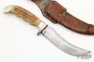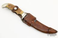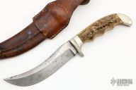 This Vintage Original Trapper Knife by Anton Wingen Jr features a satin finished blade with a sharpened top edge and notched thumbrest, .190" blade stock and 1.079" blade depth, hidden tang construction. The handle has a nickel silver guard and butt with stag scales. Comes with original brown leather sheath and a zippered case. Has some patina and scratches, has been used and sharpened, otherwise fair condition.