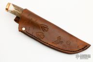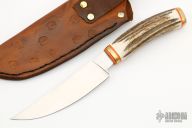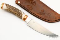 This skinner by HC Knives (please let us know if you know who this is) features a satin finished blade with notched thumbrest, .139" blade stock and 1.202" blade depth, hidden tang construction. The handle has a brass guard and butt with a stag grip and orange spacer. Coems with a brown leather sheath and zippered case. Has some light scratches, otherwise good condition.