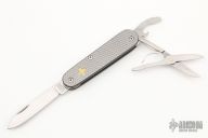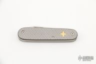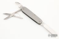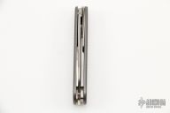 This modified Voyager has been disassembled, and has had the liners replaced with sterling silver liners. The handle has checkered Titanium covers. Has some light scuffs and scratches. Great condition. Robert Lessard Custom.