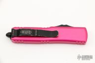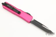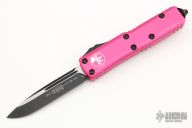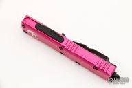 This UTX-85 by Microtech features a black finished blade. The handle has a pink aluminum frame with black hardware and tip down clip. Comes with original box and papers. Dated 06/2022 and s/n 82437. Has some scuffs, otherwise excellent condition.