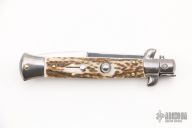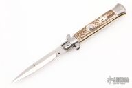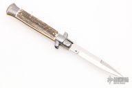 This 9" Picklock by Frank Beltrame features a polished bayonet ground blade with false top edge. The handle has stainless steel bolsters, front and rear, stag scales, brass liners, stainless spring. Excellent condition.