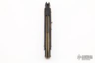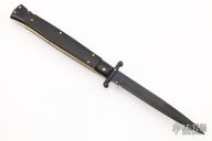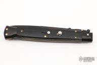 This 11" Swing Guard Auto by Frank Beltrame features a black blade with false top edge. The handle has black stainless steel bolsters, front and rear, black wood scales, brass liners, stainless spring. Excellent condition.