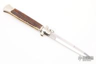 Angelo Campolin Sr. was born in 1923 in Maniago, Italy. He worked on perfecting his knife making skills before WWII and at this time made his first switchblades. After the war, in 1947 he started his company and made 30 stilettos with the marking “Angelo Campolin”. In the 1970’s Angelo’s son Gianni started to work in the company and they were specializing in folding hunting knives and also manual folding stilettos for the Robert Klaas company in Solingen Germany with their Kissing Cranes mark. In 2002 American switchblade collectors Dan Fuller, Brad West, and Tim Zinser were visiting Maniago and enjoying a few glasses of wine in a bar with Angelo Jr. and Gianni. The discussion was about a new name for some knife projects they wanted to pursue. It was Brad West that suggested the tang stamp should be AGA, for Angelo, Gianni, Angelo, thus representing three generations in the knife making business. The Campolins liked it and it stuck. In the beginning it was just a few items, but grew to the point where now there are 12 models and different scale options. The goal has been to offer quality switchblades using the old methods and traditions. Being a collector himself, Angelo Jr. knows what others like. The company headquarters has moved to Austria with production still in the original Maniago shop, as well as the others in Maniago that produce the knives for A.G.A. Campolin.