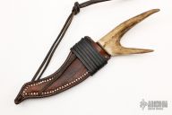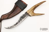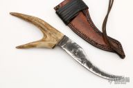 This knife by Daniel Valois features a hand forged blade from a file, .245" blade stock at the ricasso, 1.239" blade depth, hidden tang construction. The handle has a brass guard and stag grip. Comes with a brown leather sheath. New from the makers estate.