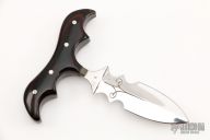 This Push Dagger by Daniel Valois features a mirror polished double edged blade with engraving, .183" blade stock and .959" blade depth, hidden/frame tang construction. The handle has dymondwood scales with a black frame. The handle has a couple of cracks, has some patina, otherwise good condition. New from the makers estate.