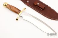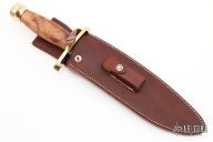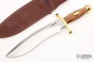 This Sasquatch by Randall Made Knives features a satin finished recurve blade with sharpened top edge, .302" blade stock and 2.275" blade depth, hidden tang construction. The handle has a lugged brass guard, brass butt, Thuya Burl grip with black spacers and a brass escutcheon. Comes with a brown leather sheath. #891 on the blade. Excellent condition.