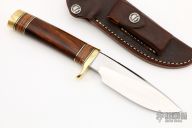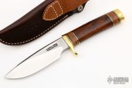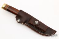 The Model 25-5 by Randall Made Knives is a drop point hunter similar to Model 11, but handle construction is reminiscent of 1930′s design. Excellent skinning, outdoors knife. This knife has a carbon steel blade with notched thumbrest, .203" blade stock and 1.332" blade depth, hidden tang construction. The handle brass guard and pommel, desert ironwood grip with stacked leather, black and brass spacers. Comes with brown leather sheath. Excellent condition.