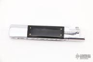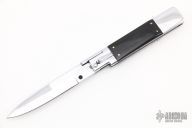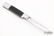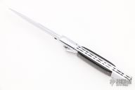 This Picklock Auto by Armenian Doctor Knives features a mirror polished bayonet ground blade with a false top edge. The handle has a polished stainless steel frame with fileworked stainless steel backspacer, buffalo horn scales with brass pins. Includes a wooden display case.  New from maker.
