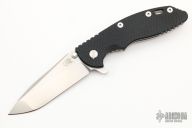 This XM-18 Flipper by Rick Hinderer Knives features a 3.5" stonewash finished blade, notched thumbrest and flipper, dual thumbstuds. The handle has a black G-10 scale, stonewashed titanium frame, clip can be mounted for tip up or down carry. Nice lockup, seating, and detent. Comes with extra pivot hardware, original box and papers. Excellent condition.