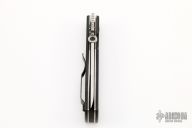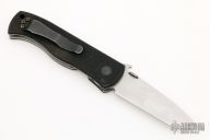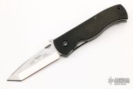 This CQC-7 by Emerson Knives has a tanto chisel ground tanto blade with notched thumbrest, wave features and a single thumbstud. Has G-10 scales, titanium liners, barrel spacers, and a tip up black stainless clip. S/N 2995. Nice detent, lockup and blade seating. Comes with original box and papers, also comes with an Emerson catalog. Has some light scuffs, otherwise excellent condition.
