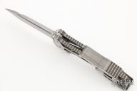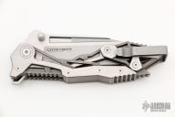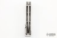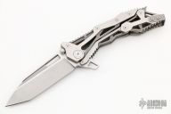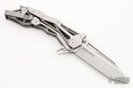 This QTR-11 X-Out from Quartermaster Knives features a stonewashed drop point tanto blade with dual thumb studs, notched thumb rest and flipper. The handle is comprised of satin finished and tumbled titanium, and stainless steel tip up clip. This knife is a G&G Hawk design. Comes with original box and papers, Has som light scratches, otherwise excellent condition.