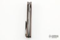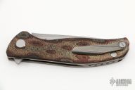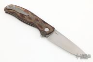 This F3R Flipper from Shirogorov has a tumble finished flat ground spear point Vanax 37 blade with notched flipper. Handle has python canvas micarta scales, tumbled titanium backspacer, tip up clip and liners. Recessed lanyard bail. Dead center blade seating, excellent detent and lockup. Excellent condition. Multi Row Bearing System. Comes with original box.