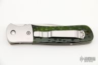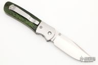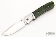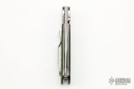 This linerlock folder is one of Charles's earlier knives and features a hand rub satin finished blade with a single thumbstud. The handle has satin finished dovetailed stainless steel bolsters, jigged bone scales, titanium liners, tip up stainless steel clip. Comes with a zippered case. Nice lockup and blade seating. Excellent condition.