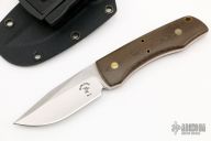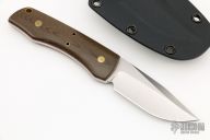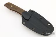 This Bulldog Fixed Blade by Charles Marlowe features a stonewash finished blade with a false top edge, .157" blade stock and 1.122" blade depth, full tang construction. The handle has green linen micarta scales with brass pins and red liners. Comes with a kydex sheath with TekLok. Has a couple light scratches, otherwise excellent condition.