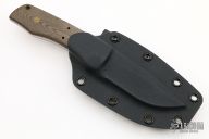 This Bulldog Fixed Blade by Charles Marlowe features a stonewash finished blade with a false top edge, .162" blade stock and 1.116" blade depth, full tang construction. The handle has green linen micarta scales with brass pins and red liners. Comes with a kydex sheath with TekLok. Excellent condition.