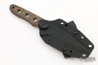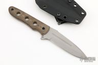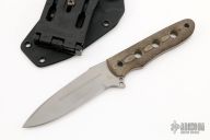 This TAD Dauntless Fixed Blade by DC Munroe features a bead blasted spear point blade with false top edge, fullers and notched thumbrest, .151" blade stock and 1.113" blade depth, full tang construction with green linen micarta scales. Comes with a kydex sheath. Excellent condition.