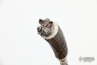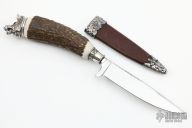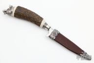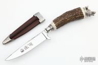 This Wild Boar boot knife by Puma features a mirror polished blade with false top edge, filework, .161" blade stock and .807" blade depth, hidden tang construction. The handle has integral bolsters, front and rear with stag scales. Comes with brown leather boot sheath with nickel silver collars. Comes with original box. #112596 on the blade. Has some patina, and some scuffs and scratches. Great condition.