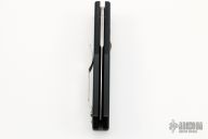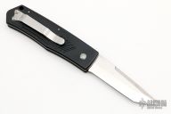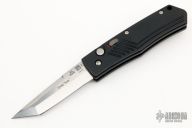 This Corby Tanto Auto by Al Mar Knives has a tumbled and polished drop point tanto blade with false top edge. Handle is black anodized aluminum with safety auto button, milled ribs, stainless steel tip up clip, and lanyard hole. Comes with a nylon belt sheath. Has some light scuffs, otherwise excellent condition.