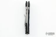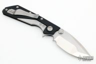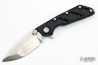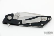 This DOC framelock flipper is a collaboration between A. Marfione and M. Strider, their names are on the clip. The blade is satin with a standard edge, dual thumb-studs, flipper and a notched thumbrest. The handle is black aluminum with non-slip inserts, and a bead blast stainless steel clip, tip up carry. Dated 07/2013 and serial number 00587. Excellent condition.