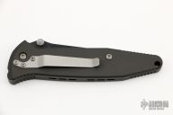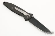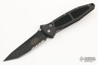This Socom D/A Auto by Microtech features a black tanto blade with partial serrations and a notched thumbrest.  The handle has a black aluminum frame with non-slip inserts and a tip down stainless steel clip. Excellent condition. Dated 5/99.  Has a couple scuffs, otherwise excellent condition.   Comes with original sheath.