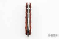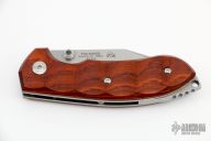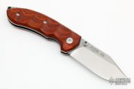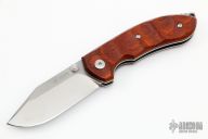 Designed by Danish knife maker Jesper Voxnæs, the Ravn bears many of the same stylistic cues found on his custom knives. The wide Bohler N690Co stainless steel with a clip point blade shape and ambidextrous thumb studs has excellent edge retention, sharpenability and corrosion resistance. Milled cocobolo scales are comfortable in hand while being elegant and refined. A solid backspacer with integrated lanyard hole allows for easy location in the pocket, or carry it on your hip with the included brown leather sheath. Excellent condition.