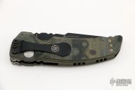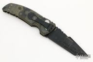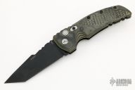This Auto by Hogue features a black tanto blade with notched thumbrest. The handle is "G-Mascus" G-10, tip up or down reversible black stainless steel clip. Has safety. Has scuffs, otherwise good condition.