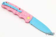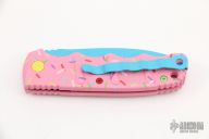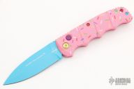 Have you ever been unfortunate enough to have to share a donut? Your plight only gets worse when you find you have to cover your high-speed, low-drag, modified, custom, mirror-edged piece of pocket jewelry in sticky sweetness. What you need is a knife designed from the ground up to go to war with a donut. And although its path to existence was unorthodox, the Dessert Warrior is here! This automatic will snap open before anyone can take more than their half of the donut. The handle is bright pink with sprinkles, and the blade has a candy blue finish, making the knife blend in with the pretty pastries of the shop. Gone are the days of not having the right tool for the job!