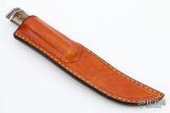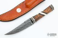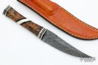 This knife by Bob Cumming features a Damascus blade with sharpened top edge, .121" blade stock and 1.184" blade depth, hidden tang construction. The handle has a polished stainless steel guard and butt with a fileworked brass spacer, burl wood grip with black/copper/mammoth ivory spacers and accents. Has some light scratches, otherwise excellent condition. Comes with a brown leather sheath.