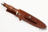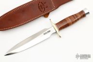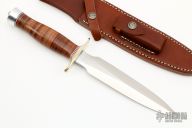 The Model 2-7 by Randall Made Knives is a heavily made dagger or dirk. Brass guard, stacked leather handle, duralumin butt cap with tang nut, red/white/blue spacers. Double edged satin finished blade, .209" blade stock and 1.246" blade depth, hidden tang construction. Comes with a zippered case and brown leather sheath. Excellent condition.