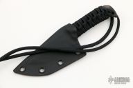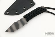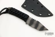 This knife by Mick Strider features a tiger stripe blade with notched thumbrest, paracord wrap, .080" blade stock and .9" blade depth, full tang construction with cord wrapped handle. Comes with kydex sheath. Excellent condition.