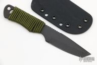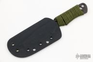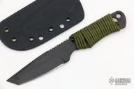 This neck knife by Crawford Knives features a black tanto blade with false top edge, notched thumbrest, .104" blade stock and .926" blade depth, full skeletonized tang with green cord wrap. Comes with a kydex neck sheath. Has a few light scuffs, otherwise excellent condition.